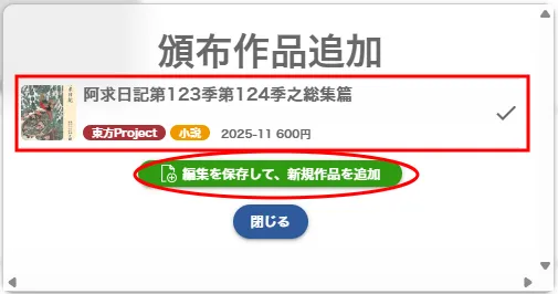 過去に登録済み作品を選択するか、新規に作品情報を登録できます(タイトル・発行日・頒布価格の3点の登録が必要)。