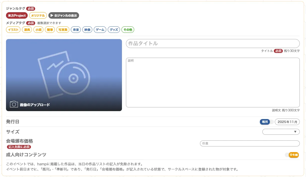 - 試験的運用として、Webカタログ「hamp」に必要事項を記載した既刊作品はサークル登録用紙への記入を省略できます