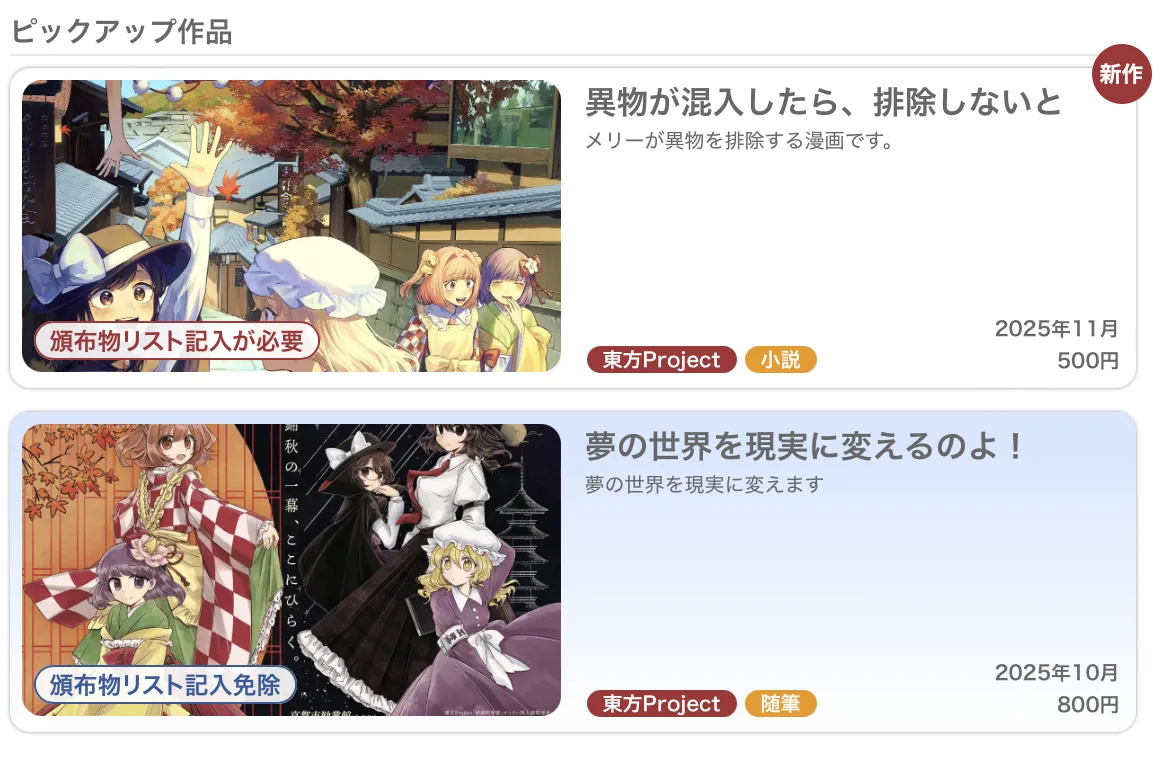 上記画面のように、作品情報欄の表示が「頒布物リスト記入免除」となっている作品が、登録用紙への記入を省略出来ます。