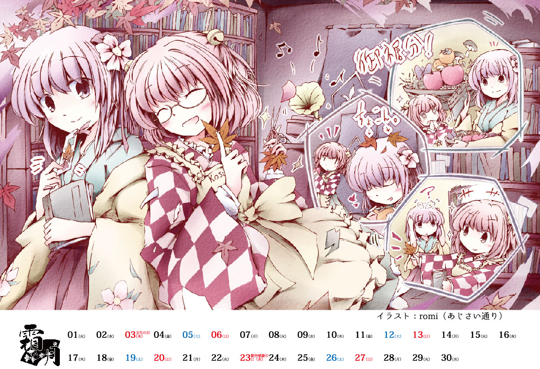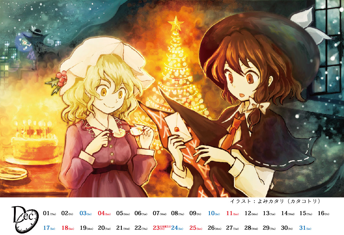 今年で5回目となる求代目の紅茶会と科学世紀のカフェテラスの合同開催を記念して、卓上ミニカレンダーを制作しました。来年は「幺樂団の歴史」と「東方求聞史紀 ~ Perfect Memento in Strict Sense.」そして「卯酉東海道 ~ Retrospective 53 minutes」の発表から10周年を迎えます。その記念すべき年を、是非阿求・小鈴そして秘封倶楽部とともにお迎えいただければ幸いです。