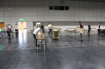 開場前に設営時間を設けておりますので、サークル参加の方は指定された時間内に会場へ入り、ご自分のスペースの設営をした上で一般参加者をお迎えします。この設営時間中は、事前に送付される「サークル通行証」を提示して会場に入りますので、忘れないようご持参ください。なお、サークル参加の方は会期中もサークル通行証で入場いただけます(カタログの購入は任意です)。