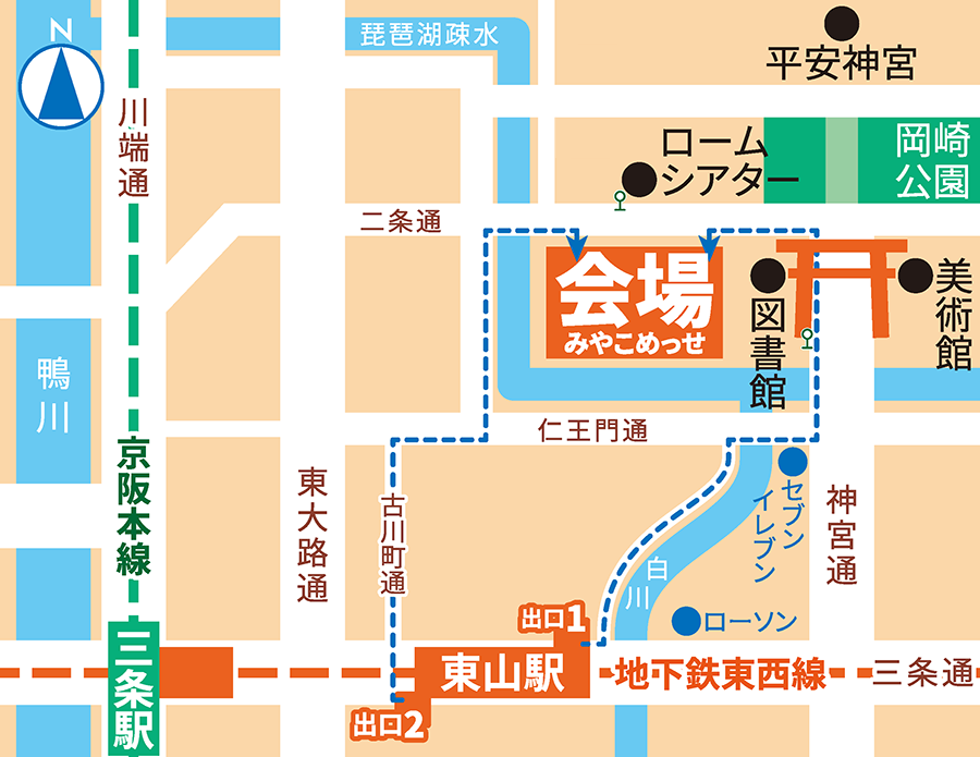 京阪三条駅から北東へ徒歩18分程度でもご来場できます。